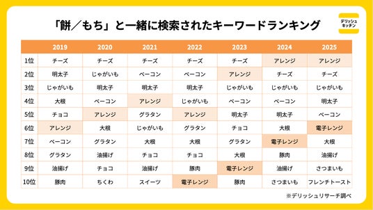 2025年の検索キーワードの組み合わせランキングでは、2024年に引き続きトップは「アレンジ」でした。お正月に余ってしまったお餅の消費方法や、マンネリ解消を求めるユーザーが多いことがうかがえます。