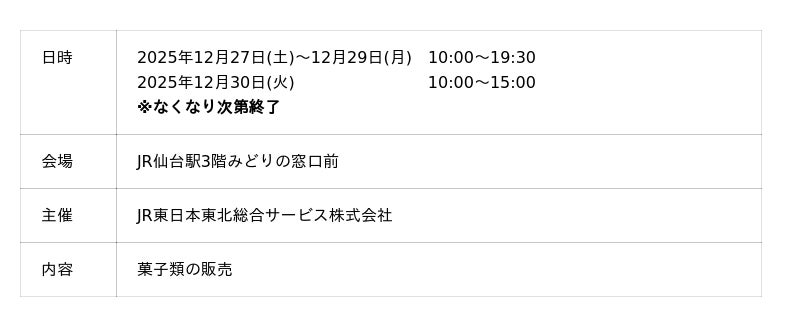2025年12月27日(土)~12月30日(火)まで仙台駅3階みどりの窓口前にて開催