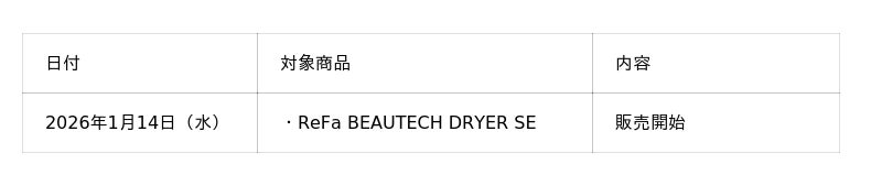 株式会社MTG(本社:愛知県名古屋市、代表取締役社長:松下剛)の美容ブランド『ReFa(リファ)』は、2025年10月から一部市場にて先行販売している「ReFa BEAUTECH DRYER SE(リファビューテック ドライヤー SE)」の全国のReFa SHOP(百貨店・ReFa表参道ヒルズ・GINZA SIXを除く)※1での予約を2026年1月7日(水)に、販売を1月14日(水)に開始いたします。また、家電量販店※2・MTG公式オンラインショップでも取り扱いを開始いたします。
