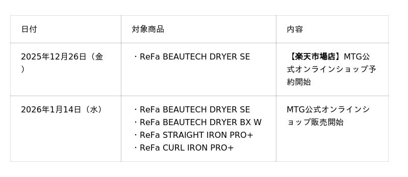 さらに、同じく2025年10月から11月にかけて一部市場にて先行発売した「ReFa BEAUTECH DRYER BX W(リファビューテック ドライヤー BX W)」、「ReFa STRAIGHT IRON PRO+(リファストレートアイロン プロ+)」、「ReFa CURL IRON PRO+(リファカールアイロン プロ+)」のMTG公式オンラインショップでの取り扱いを1月14日(水)に開始いたします。