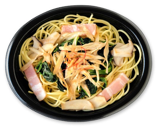 ベーコンと揚げごぼうの和風パスタ揚げごぼう・ベーコン・ほうれん草・エリンギの白だし和風パスタです。あっさりなのに素材の旨味を味わえるやさしい味わいです。