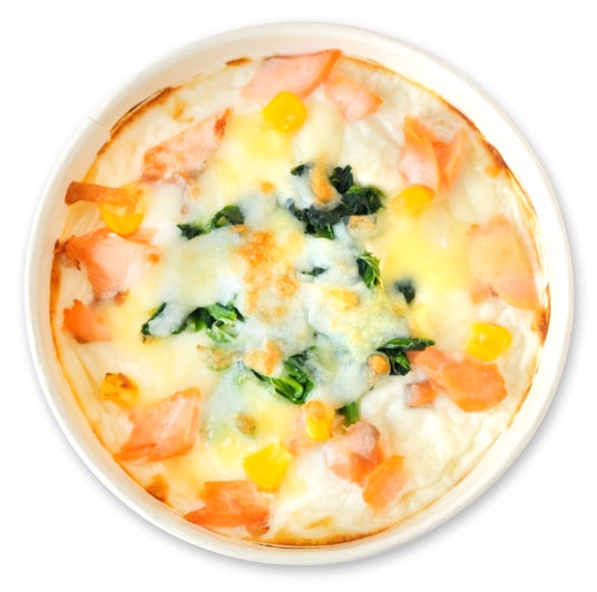 サーモンとほうれん草のグラタンほうれん草・サーモン・玉ねぎ・コーンが入ったとろ~りなめらかなグラタンです。熱々にしてパンと一緒にお召し上がりください。
