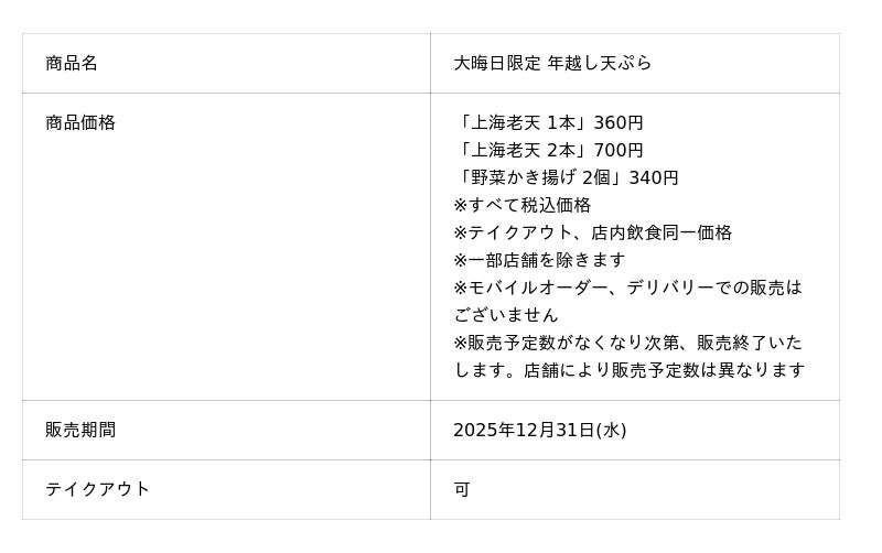 大晦日限定「上海老天」を10万尾用意!年越しを彩る年越し天ぷらパックを全国のはなまるうどんで販売