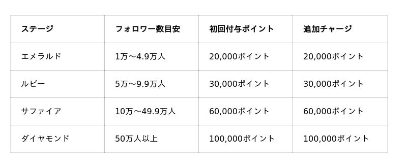 フォロワー数に応じた「ステージ」に基づき、体験予約に使えるポイント(VELTRAポイント)を付与します。