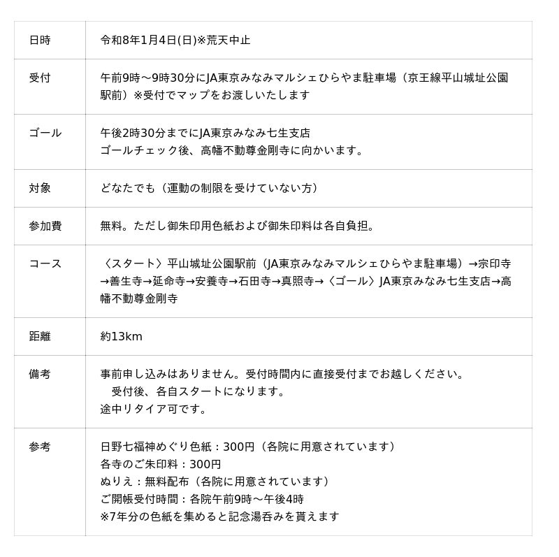 日野市内の七福神(宗印寺「布袋尊」善生寺「子寶大黒天」延命寺「寿老尊」安養寺「毘沙門天」石田寺「福禄寿」真照寺「恵比寿天」 高幡不動尊金剛寺「弁財天」)を巡る約13kmのコースです。各寺院では専用色紙に御朱印(優良)を頂くことができ、お子様にはぬりえを用意しています。参加作品は高幡不動尊 五重塔 塔院地下にて展示もできます(展示期間:3月第二土曜日~4月第三金曜日まで)。七福神めぐりを7年参拝した方は記念品も授与されます。
