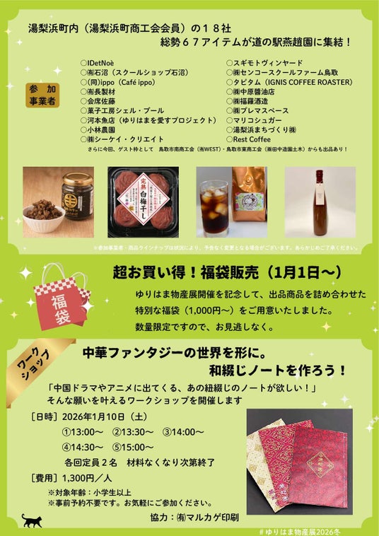 湯梨浜町の地元企業の食べ物や雑貨などをギュっと集めた[ゆりはま物産展]を開催 [道の駅燕趙園][12月25日~1月25日]1/10限定で和綴じノート作り体験も♪