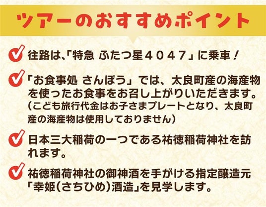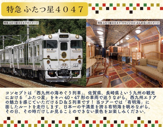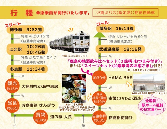 (1) ツアー名称:「特急 ふたつ星4047」で行く!「太良の味覚」と「鹿島の日本酒」満喫たび(2)出発日:2026年1月31日(土) 日帰り
