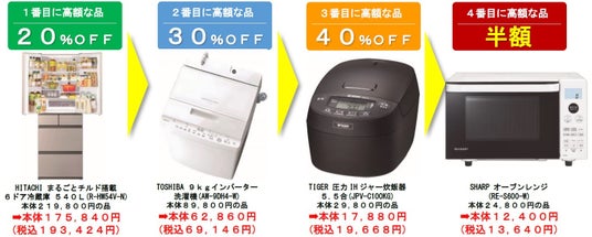 人気商品からオリジナル商品まで全177品目の家電や暮らしの品を対象に、購入点数に応じて割引率が1点目2割引→4点目半額にステップアップする、買えば買うほどお得なお年玉企画です。
