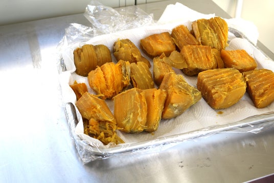 まずは大きなサツマイモの形を整え、適温でじっくり蒸し上げます。サツマイモのデンプンが糖化する温度を見極めながら、甘さを最大限に引き出します。
