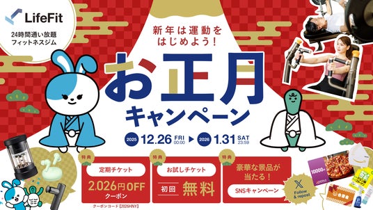ITを活用したヘルステック事業を展開する株式会社FiT(本社:京都府京都市、代表取締役:加藤恵多、以下「FiT」)は、2025年12月26日(金)~2026年1月31日(土)の約1ヶ月間、24時間フィットネスジム「LifeFit」にて「新年は運動をはじめよう!お正月キャンペーン」を開催いたします。