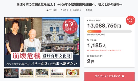 「崩壊寸前の老舗食堂を救え! ~100年の昭和遺産を未来へ。祖父と孫の挑戦~」(CAMPFIRE)