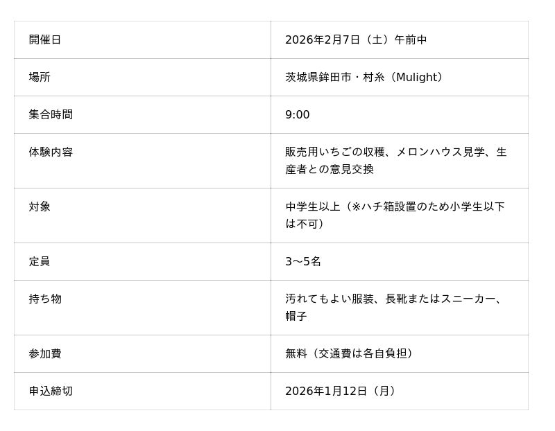 株式会社フューチャーリンクネットワーク(本社:千葉県船橋市、代表取締役:石井丈晴、以下FLN)は、茨城県鉾田市と連携し、「チイオシ鉾田市農業体験プロジェクト」第六弾として、2026年2月7日(土)に「村糸」でのいちごの収穫体験プログラムを実施いたします。
