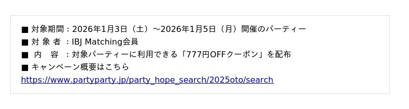 【IBJ Matching】年始期間中、全国で婚活・街コンイベントを開催 -会員限定「お年玉キャンペーン」を実施 -