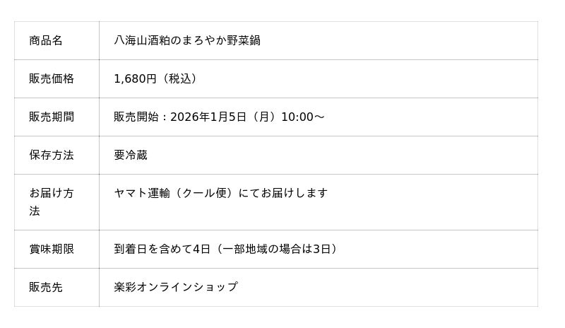 d130004-120-d6711571f54c143ad8bb8a2e0c690555.pdf 楽彩株式会社(本社:東京都足立区、代表取締役社長:大崎善保)は、2026年最初の新商品として、新潟の銘酒「八海山」の酒粕を贅沢に使用した『八海山酒粕のまろやか野菜鍋』を、2026年1月5日(月)より発売いたします。