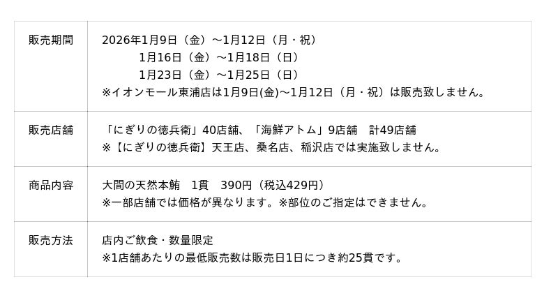 コロワイドグループの株式会社アトム(本社:神奈川県横浜市 代表取締役社長:植田剛史)が展開する回転寿司業態の「にぎりの徳兵衛」「海鮮アトム」各店で、2026年1月9日(金)から、 “大間”の天然本鮪をにぎりの徳兵衛、海鮮アトムで初めて、期間限定で販売いたします。