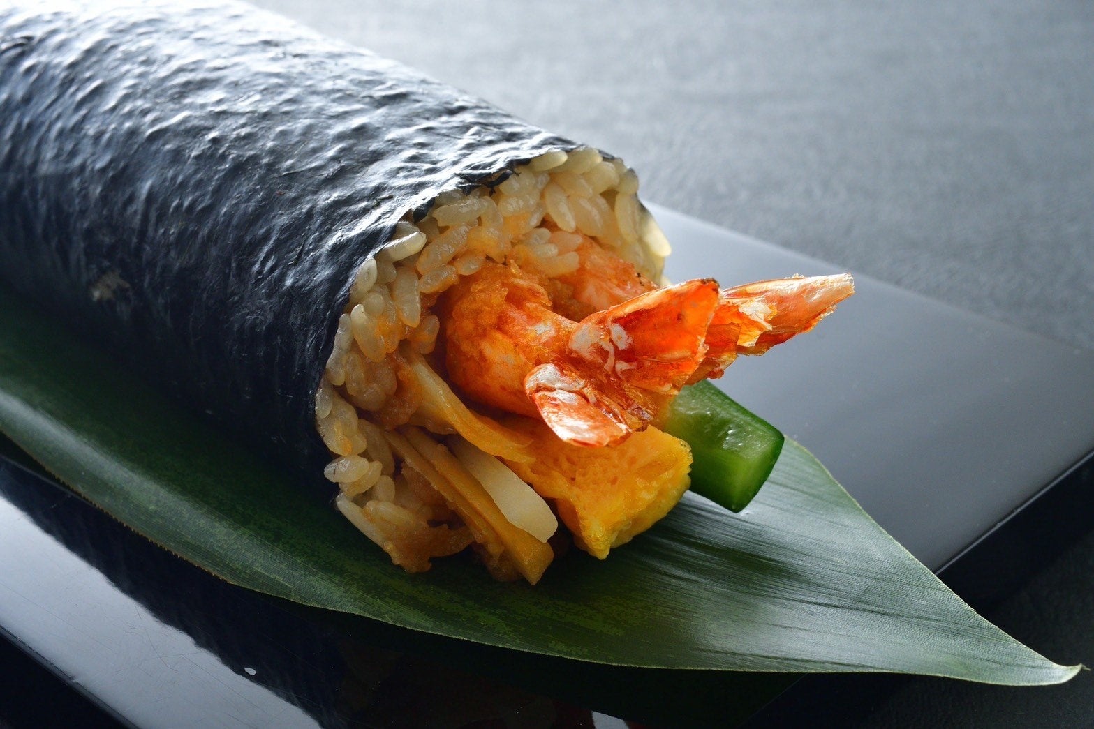 〈金子半之助〉海老天恵方巻 1,600円大海老天を4本使用し「金子半之助」の代名詞ともいえる秘伝の丼たれを合わせた一品です。玉子ときゅうりが海老天の旨みを引き立てる、天丼屋ならではの恵方巻。