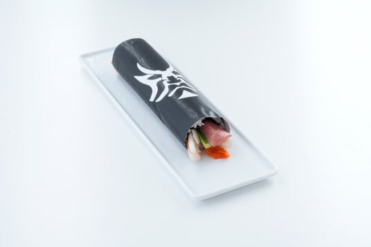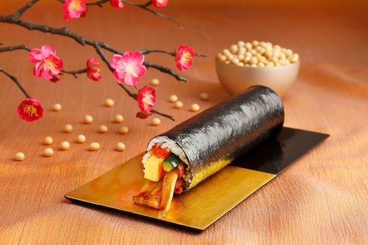 2025年に引き続き2026年も大注目の歌舞伎。歌舞伎の隈取モチーフをプリントした海苔で、大間の本まぐろや車エビなど豪華海鮮7種を巻きました。
