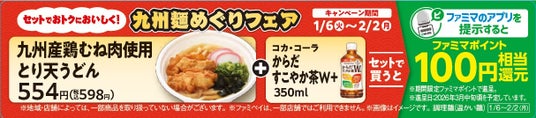 期間中、「九州麺めぐりフェア」対象の調理麺とコカ・コーラ「からだすこやか茶W+350ml」をファミマのアプリ「ファミペイ」を提示して、セットでご購入いただくと、ファミマポイント100円相当を還元いたします。