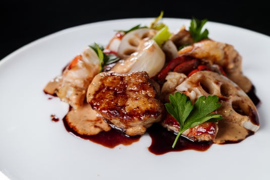 オマール海老と仔牛の喉元 リードヴォーに薄く粉をまとわせてソテーし、甘みを含むフォンドヴォーと赤ワインの艶のあるソースでまとめました。