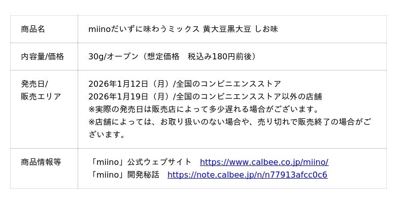 カルビー株式会社(本社:東京都千代田区、代表取締役社長兼CEO:江原 信)は、豆まるごとのおいしさをいつでもどこでも楽しめる「miino(ミーノ)」シリーズより、素揚げした大豆2種類をミックスした新商品『miinoだいずに味わうミックス 黄大豆黒大豆 しお味』を2026年1月12日(月)から、全国のコンビニエンスストア先行で期間限定発売します。コンビニエンスストア以外の店舗では、2026年1月19日(月)から期間限定発売します(2026年5月下旬終売予定)。また、節分に合わせて“北海道産ゆきほまれ”の『miino大豆しお味 三角パック』節分デザインを、2026年1月12日(月)より全国のコンビニエンスストア以外の店舗にて数量限定で発売します。なくなり次第、終了。