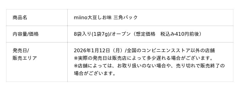 同日には、“北海道産ゆきほまれ”のみを使用した『miino大豆しお味 三角パック』も発売します。ロカボ認証※を取得しており三角形の個包装パッケージです。