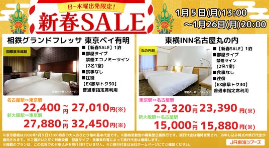 株式会社ジェイアール東海ツアーズ(本社:東京都中央区、以下JR東海ツアーズ)は、2026年1月5日(月)13:00より「日~木曜出発限定!新春SALE」を開催いたします。