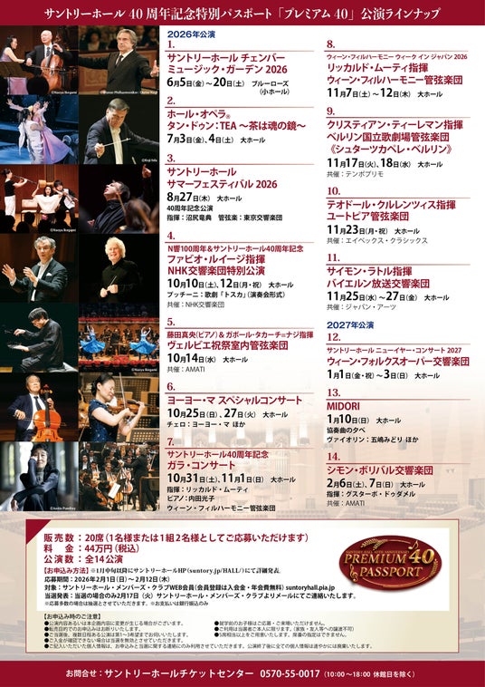 2026年、サントリーホールは開館40周年を迎えます。ご愛顧いただいたお客様への感謝の気持ちを込めて、豪華で多彩な公演をお楽しみいただく、特別パスポート「プレミアム40」をご用意しました。年間を通じて、サントリーホールの主催公演をはじめとするラインナップをご堪能いただけます。全14公演ドリンクチケット付き、特別イベントなども予定しています。2026年をサントリーホールで音楽を心ゆくまで楽しむ特別な年にしませんか?多くのご応募をお待ちしております。