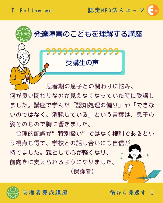 【発達障害のこどもを理解する講座】申込:https://npoedge-hattatsu202601.peatix.com