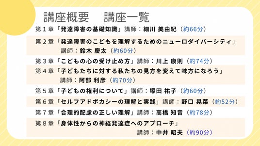 講座は「発達障害とは何か」から始まり、LD・ADHD・ASDなどの特性、ニューロダイバーシティ、心の受け止め方、リフレーミング、こどもの権利やアドボカシー、合理的配慮まで、こどもを取り巻く多様な背景に目を向け、事例やワークを通して学校現場や支援の現場で活かせる基礎的な知識と実践的な視点の習得をめざします。