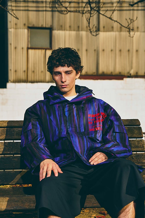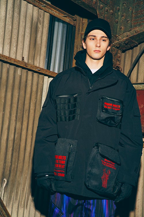 雪原の輝きと都市の未来を結びつける「SECRET EMBER FIREMAN JACKET」。 消防士のユニフォームを着想源にした力強いシルエットとリフレクティブなラインは、厳しい環境に挑む人々の姿を映し出し、着る人に頼もしさと高揚感を与えます。黒・赤・青の3色展開はそれぞれ異なる個性を放ち、都市のシーンから雪山まで自在に対応。背面にはメッセージ性のあるプリントを施し、自然と人との関わり、そして未来への視点を投げかけます。