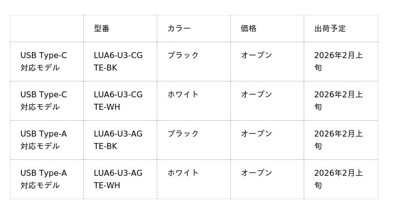 株式会社バッファロー(本社:東京都千代田区、代表取締役 社長執行役員CEO:牧 寛之)は、挿すだけでLANポートのない機器で有線LANを使用することができるようになる有線LANポート(1000BASE-T/100BASE-TX/10BASE-T)を搭載した、USB3.2(Gen 1)対応USB接続の有線LANアダプター USB Type-C対応モデル「LUA6-U3-CGTEシリーズ」と、USB Type-A対応モデル「LUA6-U3-AGTEシリーズ」をそれぞれブラックとホワイトの2色展開で2026年2月上旬より順次出荷、販売いたします。