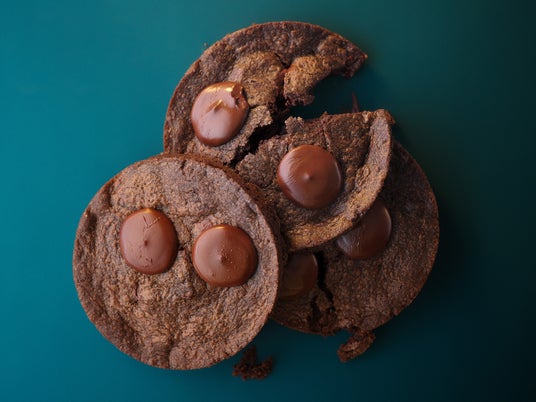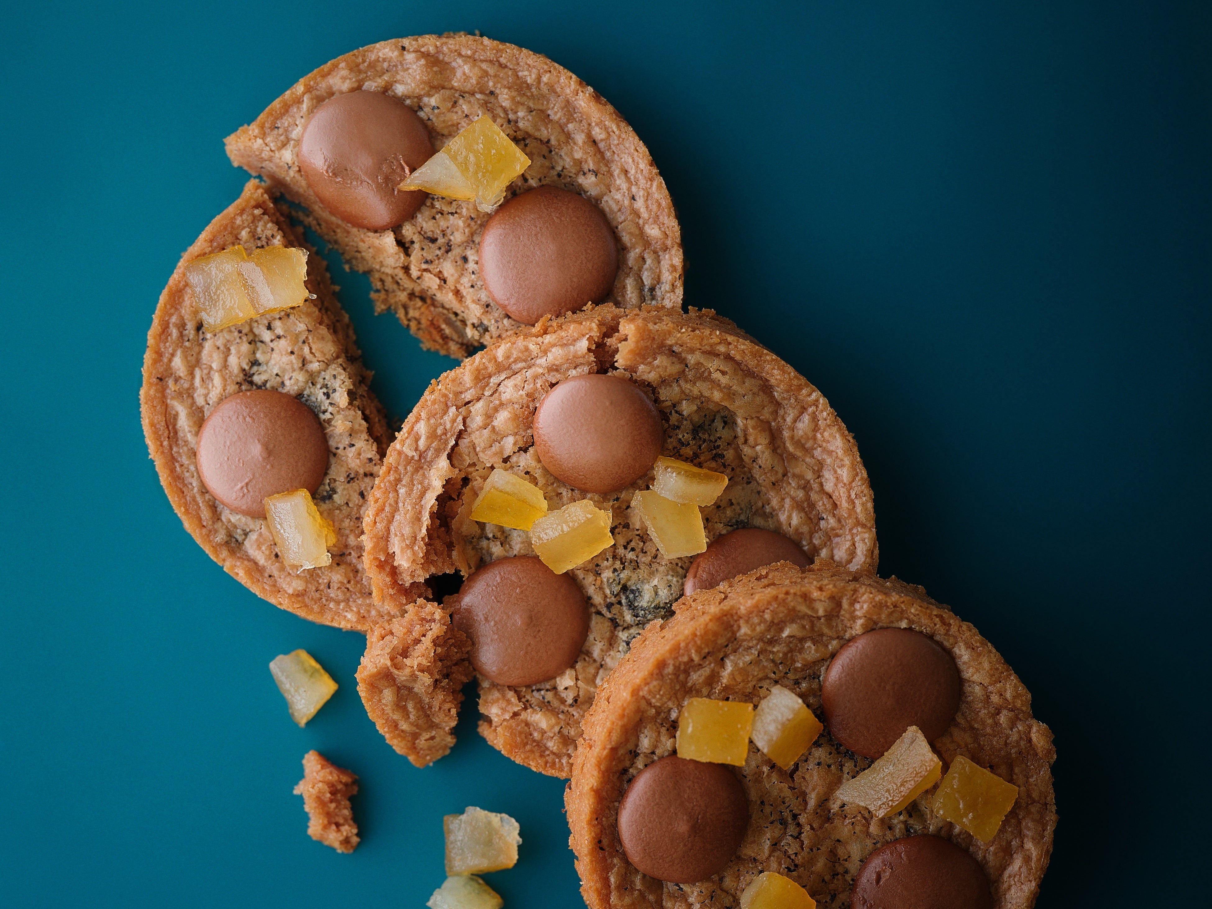 内側には単一品種ガナッシュのボンボンショコラを丸ごと1粒包んで焼き上げ、仕上げにチョコチップをトッピングしました。濃厚で贅沢なチョコレートクッキーです。