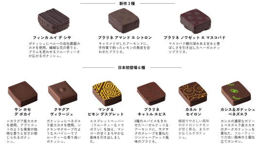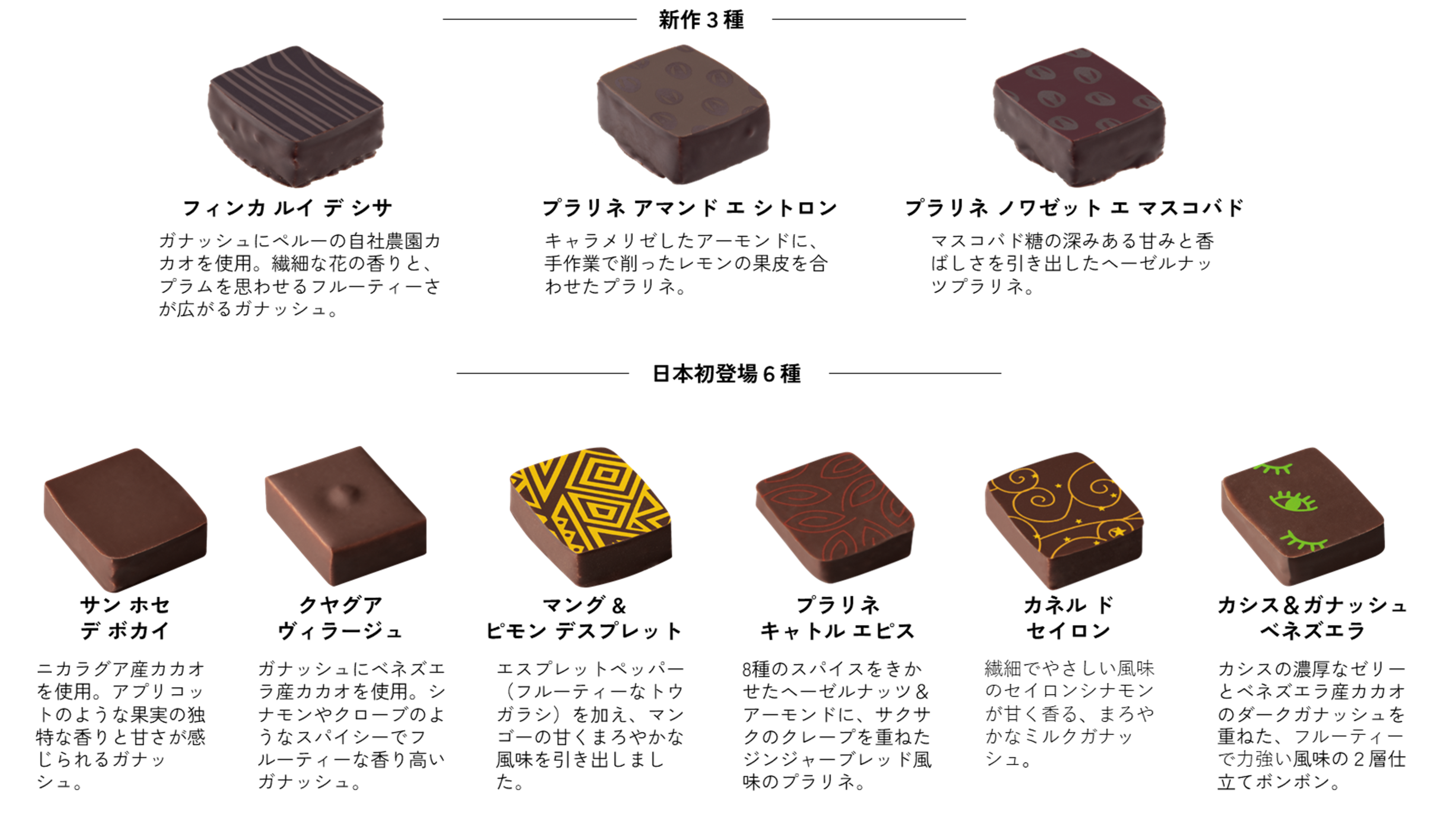 14個入りには、新作〈プラリネ アマンド エ シトロン〉に加え、日本初登場の〈マング&ピモン デスプレット〉〈カネル ド セイロン〉〈プラリネ キャトル エピス〉など、素材の個性を生かしたフレーバーをセレクト。