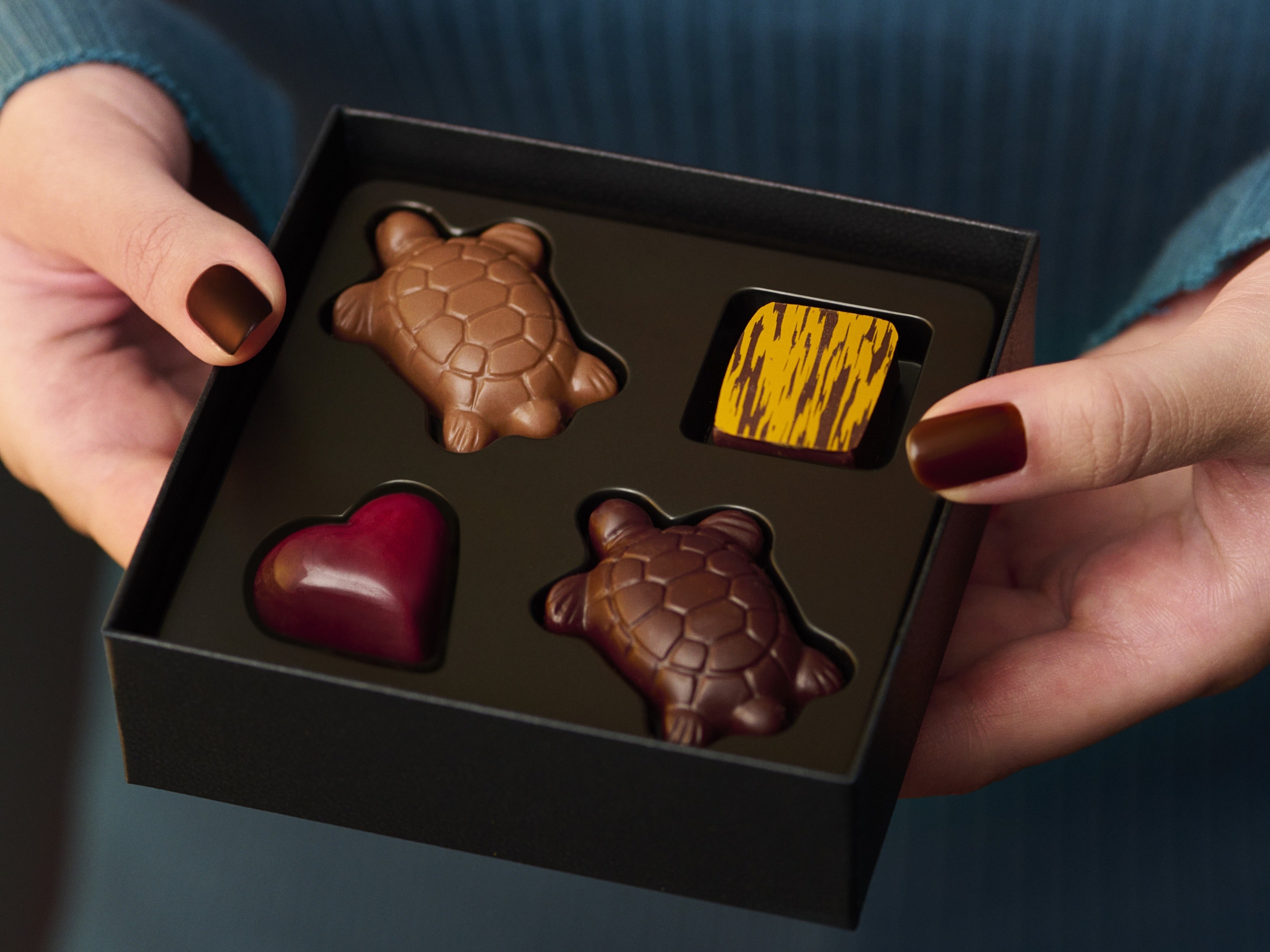 遊び心あふれるカメのショコラと、鮮やかなボンボンの組み合わせが楽しい、虎ノ門ヒルズ店限定の特別なセットです。