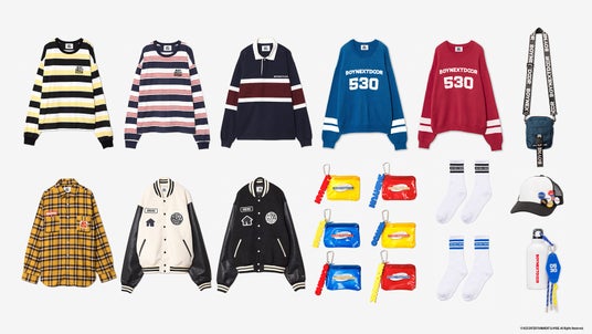 今回販売するのは「気の合う仲間と遊びに出かけるアクティブな一日」をテーマに、BOYNEXTDOORのメンバーをイメージしてデザインした、ボーダー柄のロングTシャツやスタジャン、ショルダーバッグなど全10型のアイテムです。リップポーチやウォーターボトルなど、遊び心のある小物も展開し、軽やかなアメリカンカジュアルスタイルを表現しています。