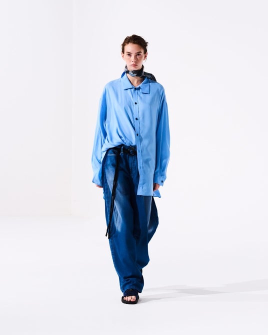 ビッグシルエットのブルーブラウスは、左右で異なるヘムの長さが生むリズムが特徴。