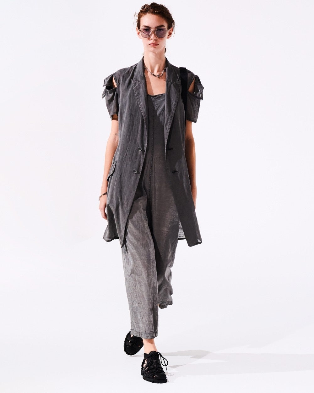 アシンメトリージャケットと、フラシで揺れるパンツを合わせた軽やかなコーディネート。