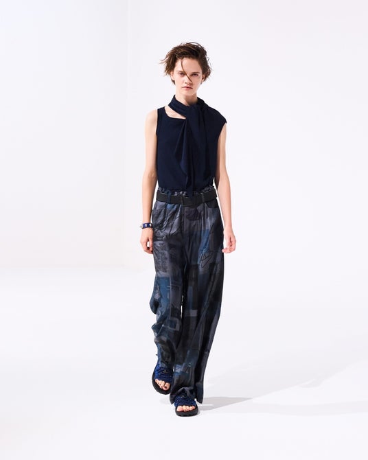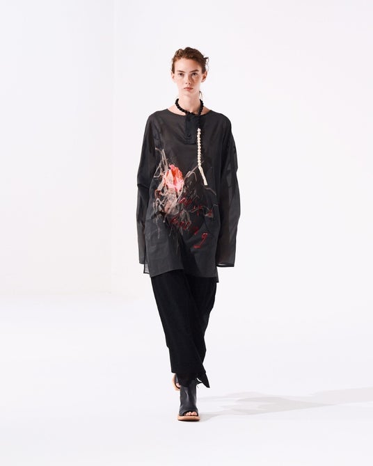 ブラウスはアンティークのツボをモチーフにコラージュした柄で、メンズライクなシルエットをベースに襟元の紐が柔らかなネックラインをつくり、程よい抜け感と軽やかさを生む。