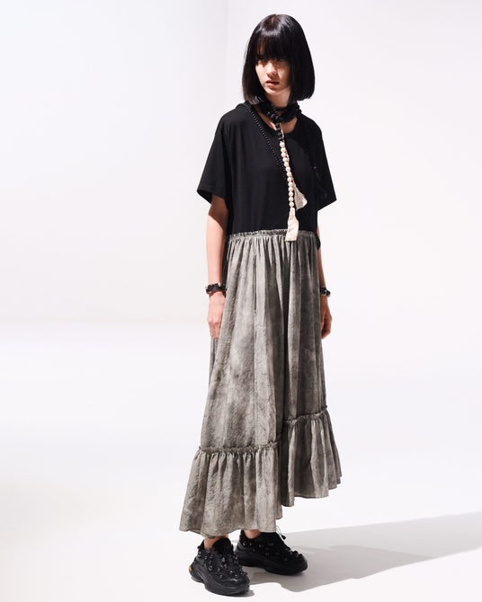 ゆったりとしたロングシルエットをベースに、フロントのフレアと後身頃のギャザーで動きを加えたドレス。