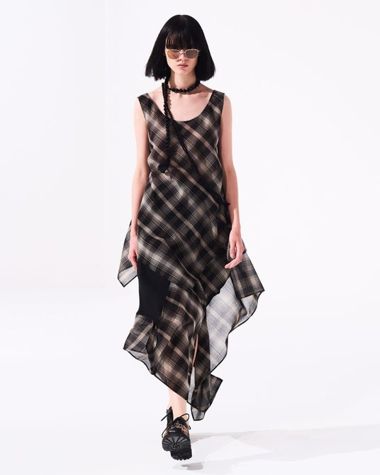 ドレープの揺れがフェミニンな表情を引き立て、軽やかなチェック柄を纏う。