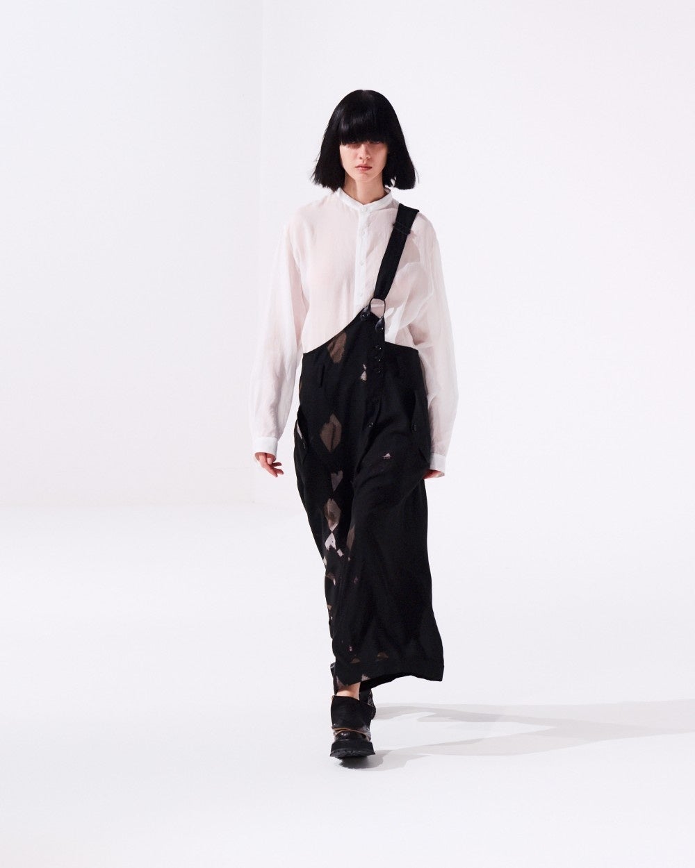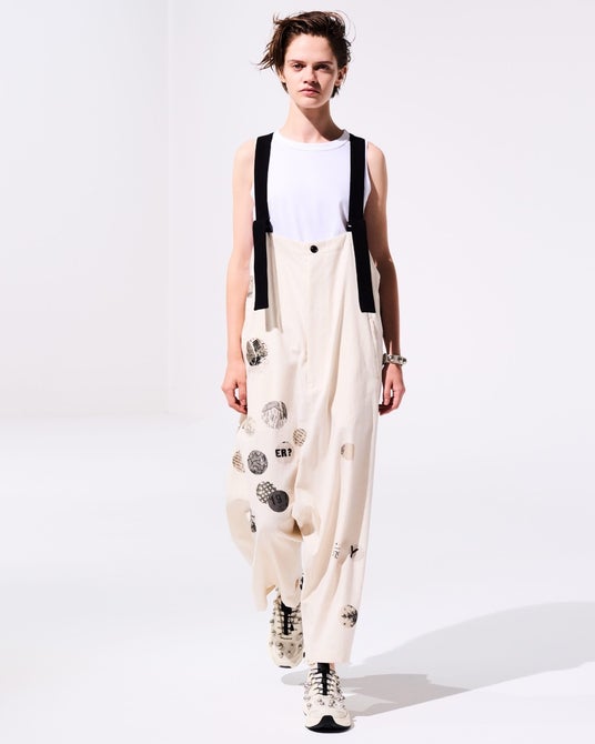 新聞紙や天使のモチーフをドット状に切り抜き再構築したオーバーオール型ペインターパンツ。