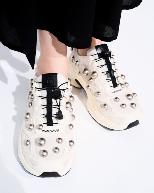 スニーカーは半円スタッズを無造作に散りばめ、存在感を放つ。