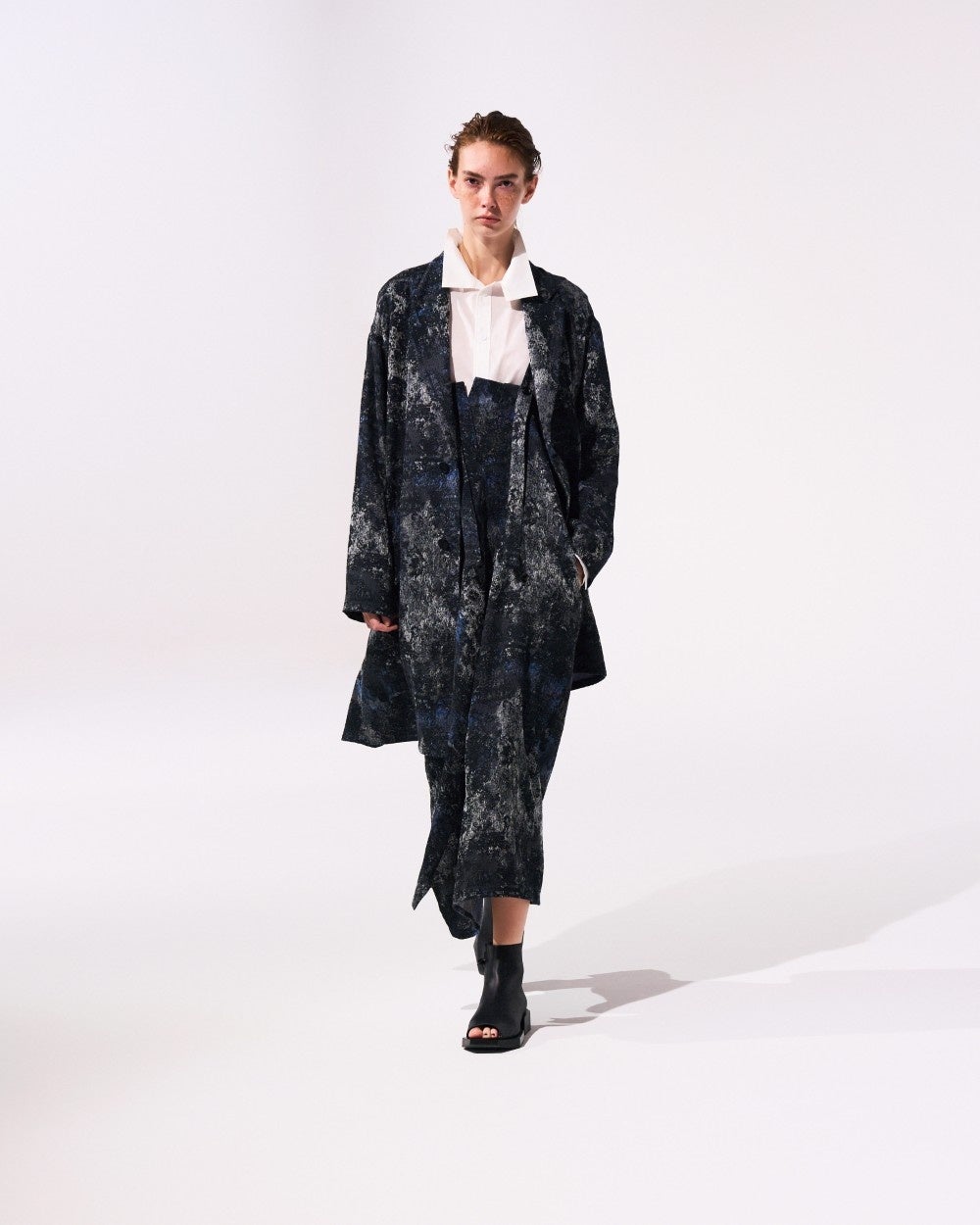 柄の遊び心と構築的シルエットを両立させ、角度によって異なる表情を見せる。