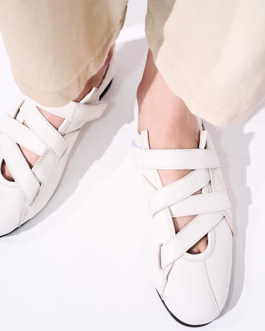 スニーカーとバレエシューズを融合させたフラットシューズがリラックス感のあるムードを添える。