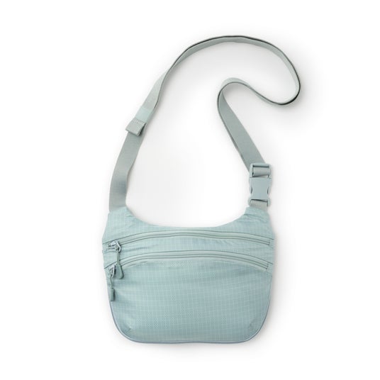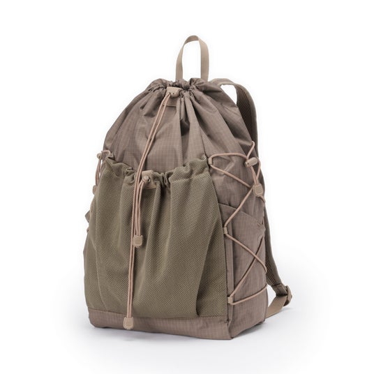 ナイロン地に強度の高いポリエステルの糸を格子状に織り込んだリップストップ生地は、パラシュートやテント、寝袋などアウトドア用品に活用される素材です。軽くて丈夫なので、普段使いはもちろん、春夏のレジャーシーンやジム通い用のバッグとしても使用できます。また、生地には再生素材を100%使用し、一部に撥水加工を施しています。
