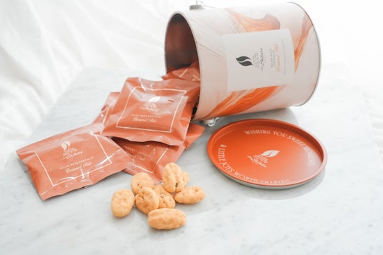 高級感のあるデザイン缶に個包装のペカンナッツショコラが10袋入っています。お配り用にも、ご自身へのご褒美にも。