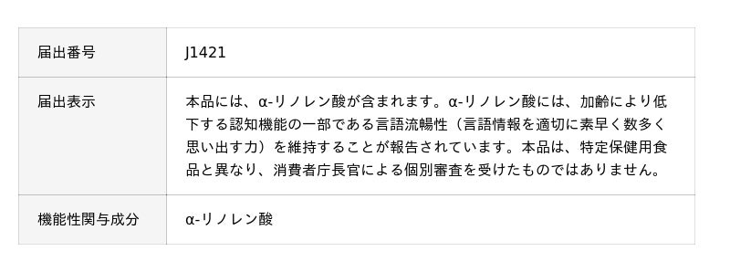 本製品は、えごま油100%の機能性表示食品です。えごま油とは、えごまの種子を搾った油で、α-リノレン酸を代表とするn-3系脂肪酸をたっぷり含むことが特徴です。α-リノレン酸を機能性関与成分として、加齢により低下する認知機能の一部である「言語流暢性(言語情報を適切に素早く数多く思い出す力)」を維持することが報告されています。