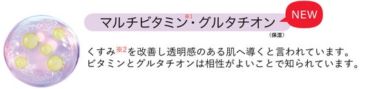 マルチビタミン(保湿)※1に加えて、ビタミンと相性が良いと言われているグルタチオン(保湿)を新配合。4種の色光補正パウダーで、日やけによるシミを予防しながら、透明感のある輝きを放つ発光肌へ導きます。
