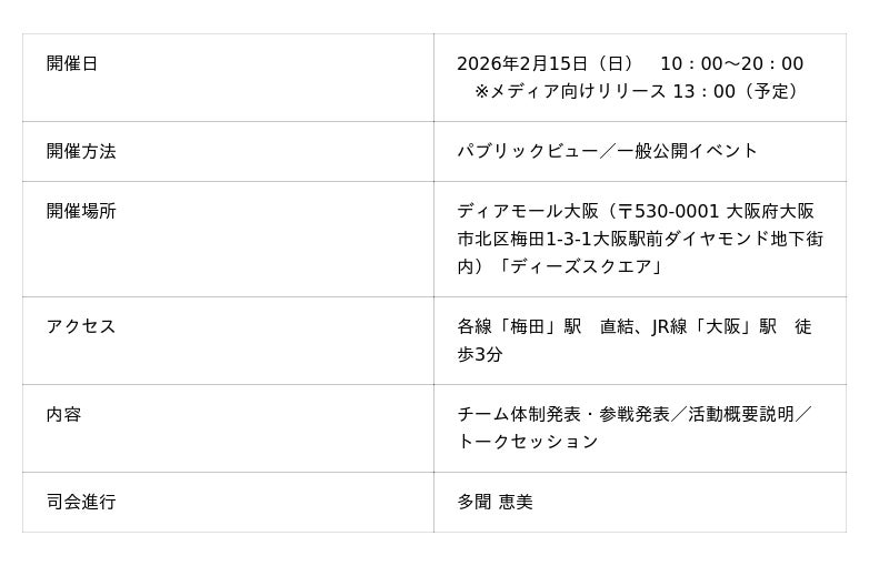 2026年2月15日(日)一般来場者及びメディア向けの体制発表会を開催! (メディアリリース向け時間枠設定 開始予定:13:00~)