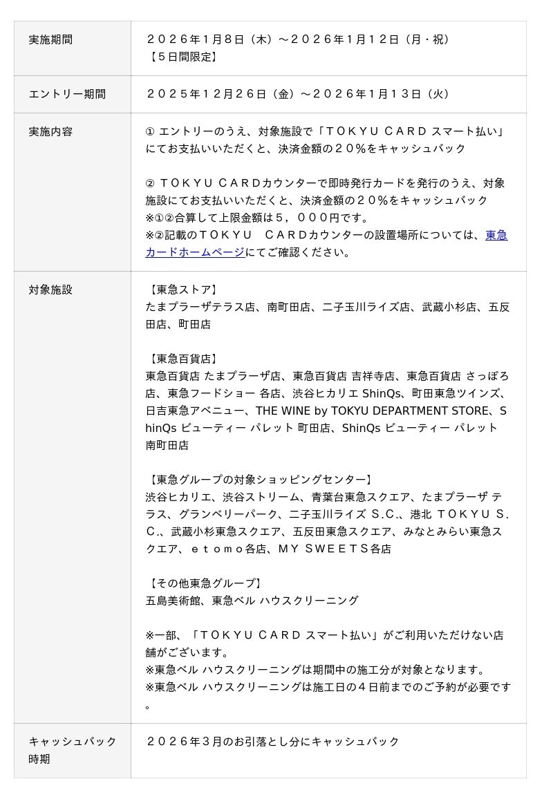 2026年1月8日(木)~1月12日(月・祝)の5日間限定対象施設で「TOKYU CARD スマート払い」利用で20%キャッシュバック